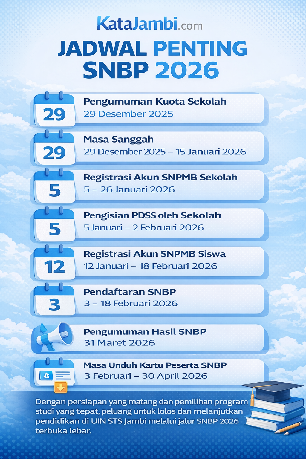 Dengan persiapan yang matang dan pemilihan program studi yang tepat, peluang untuk lolos dan melanjutkan pendidikan di UIN STS Jambi melalui jalur SNBP 2026 terbuka lebar.